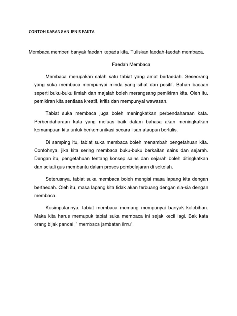 Seseorang yang suka membaca mempunyai minda yang sihat dan positif. Perdana Menteri menyeru rakyat supaya berjimat cermat tujuan menjamin kebahagiaan dan kesejahteraan hidup banyak faedah yang dapat diperoleh jika amalan in menjadi budaya masyarakat. Cara penulisan karangan jenis berita 1.